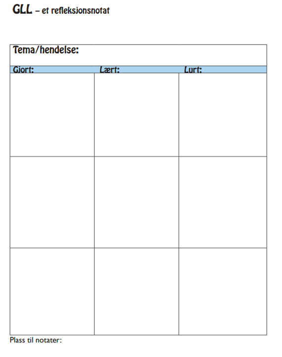 GLL-metoden er en måte å skrive logg på, knyttet til kollektiv evaluering og refleksjon. Når man benytter et slikt skjema, ser man på hendelsen med et utenfrablikk.