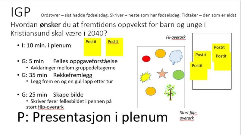 Under her ses et eksempel på en IGP tilpasset fremtidsbildeskaping. I denne varianten er det satt av 5 min til at gruppen får felles forståelse for oppgaven, så det ikke brukes unødig tid på misforståelser.